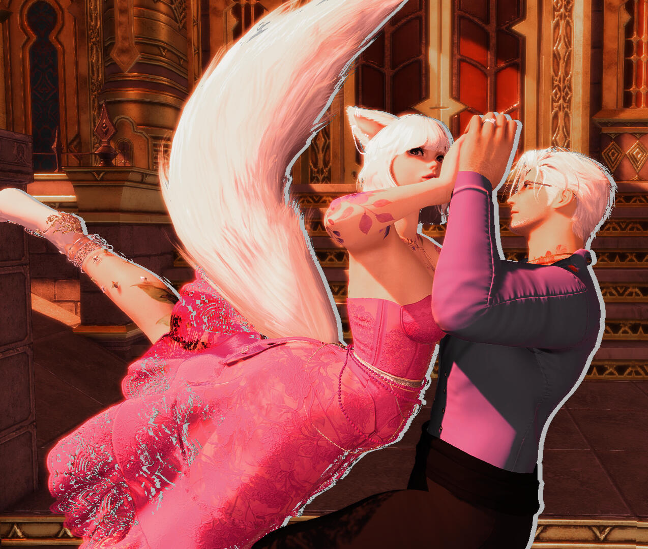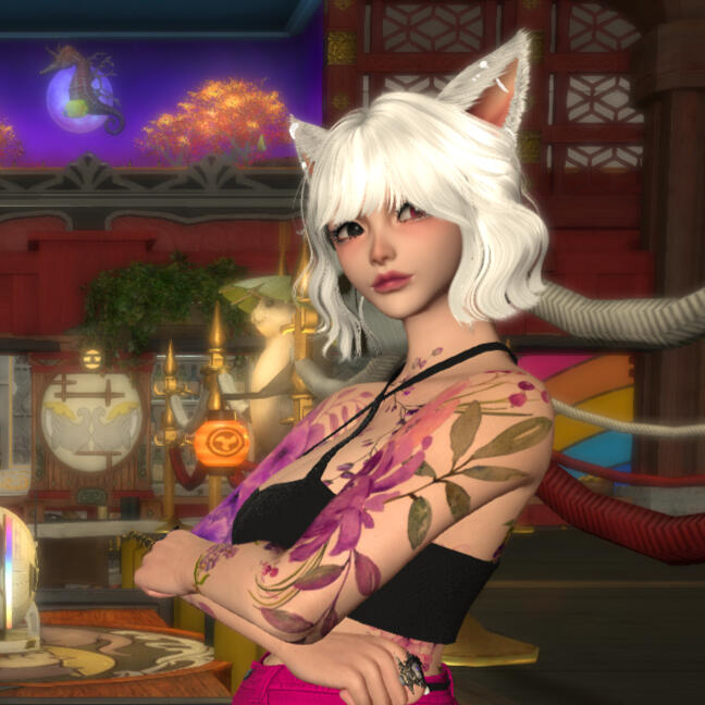 Ezzie was born and raised in Gridania. She spent her childhood wandering the Shroud catching frogs and picking flowers. Over time, she learned to play the harp, cook exquisite foods, and barter for items. Bartering was her favorite thing. She could start with a small rock and end the day with a bottle of Lominsan porter.One day while bartering in Ala Mhigo, she saw a shirtless man with white hair who captured her attention. They met eyes momentarily and with complete disregard to the spar happening, walked right up to him to introduce herself. In that moment, his gaze had moved from her to the young man, who was about to sweep his leg right into her! The man with the white hair moved her out of the way with the quickness that only a monk could have and stopped her from getting hit. Within months, the two of them were married in the Shroud. Xavier and Ezzie have been inseparable since. Together, they own and operate The Dueling Otters.Ezzie spends the majority of her time out in Eorzea bartering for goods to serve at The Otters, gathering herbs and crops from various locations and finding the most interesting housing decorations to use.