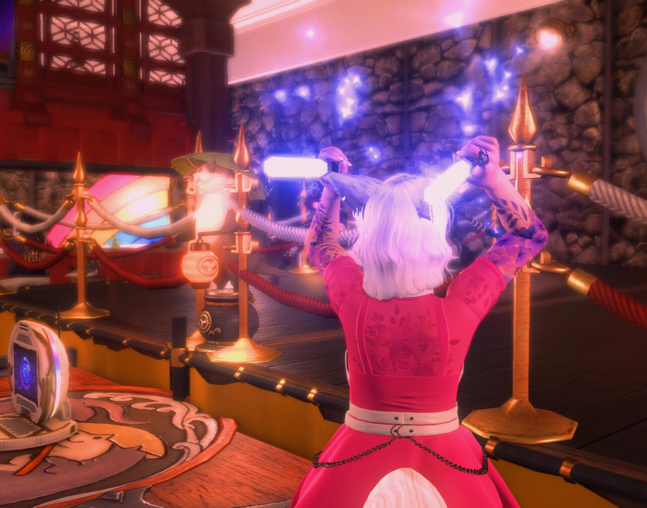 Ezzie was born and raised in Gridania. She spent her childhood wandering the Shroud catching frogs and picking flowers. Over time, she learned to play the harp, cook exquisite foods, and barter for items. Bartering was her favorite thing. She could start with a small rock and end the day with a bottle of Lominsan porter.One day while bartering in Ala Mhigo, she saw a shirtless man with white hair who captured her attention. They met eyes momentarily and with complete disregard to the spar happening, walked right up to him to introduce herself. In that moment, his gaze had moved from her to the young man, who was about to sweep his leg right into her! The man with the white hair moved her out of the way with the quickness that only a monk could have and stopped her from getting hit. Within months, the two of them were married in the Shroud. Xavier and Ezzie have been inseparable since. Together, they own and operate The Dueling Otters.Ezzie spends the majority of her time out in Eorzea bartering for goods to serve at The Otters, gathering herbs and crops from various locations and finding the most interesting housing decorations to use.